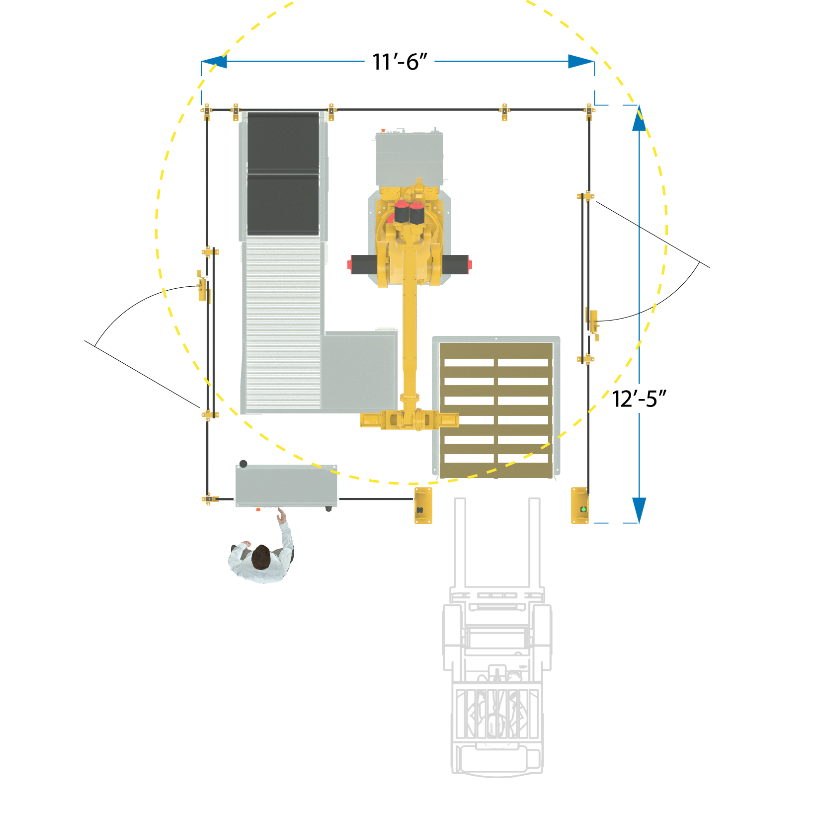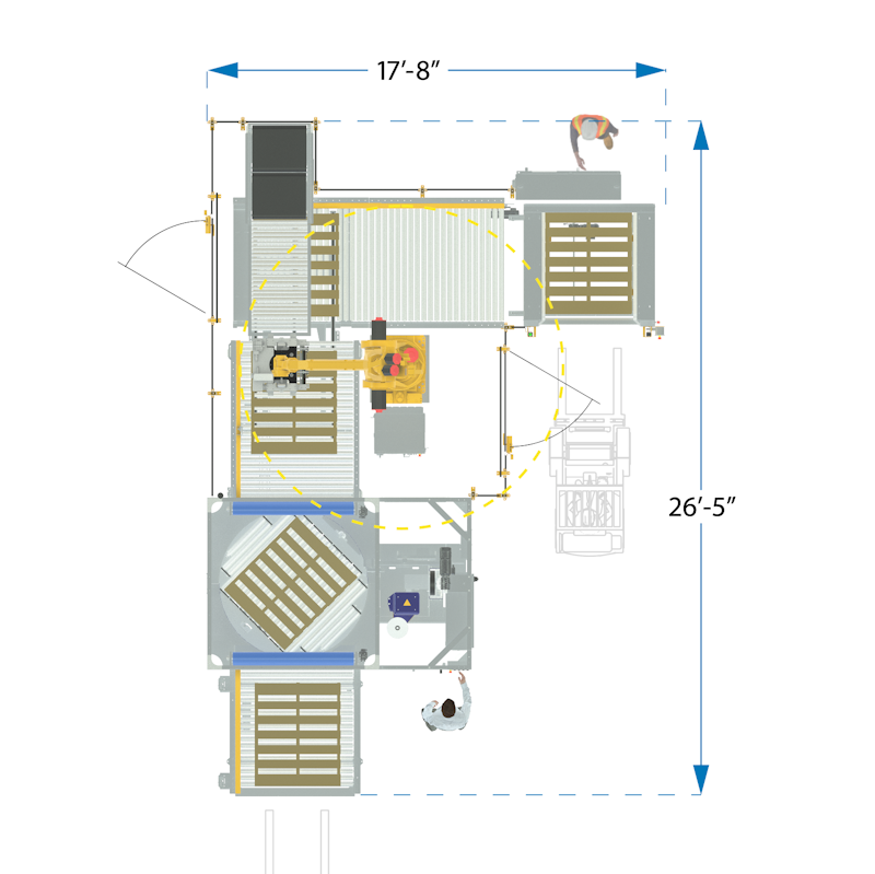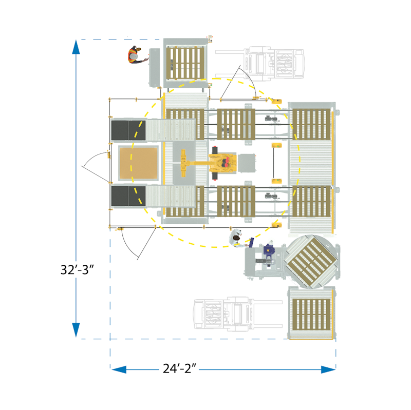Once a layer is completed, four-sided clamping centers the layer on the pallet and a tight uniform layer is deposited. Vertical travel capabilities of the apron reduce robot reach requirements allowing use of the smaller, faster, and more economical Fanuc robots. The layer apron also provides a queuing platform for continued layer building while optional concurrent stretch wrapping occurs.