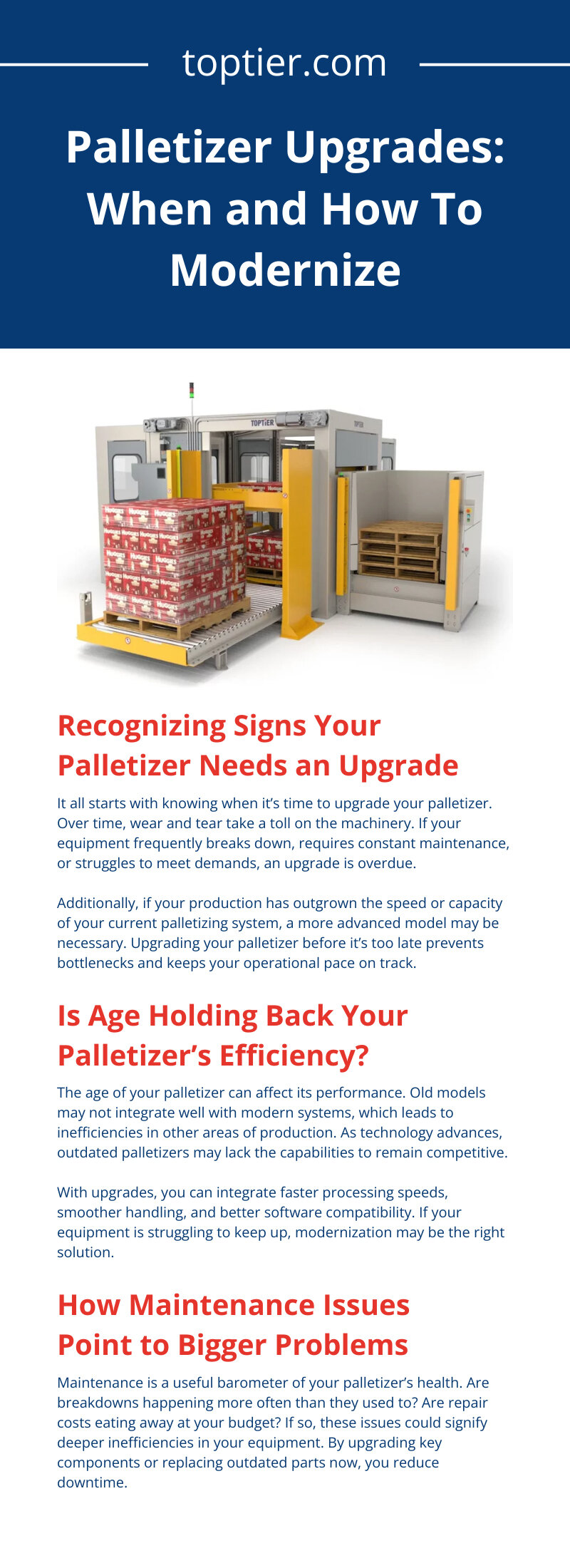 If your palletizer has outdated core components, a full replacement might better suit your long-term goals. A low-level case palletizer from TopTier can deliver a reliable solution without compromising adaptability or efficiency.