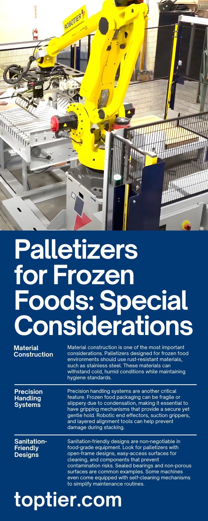 If you want to upgrade your product handling system, understanding the special considerations of palletizers for frozen foods will help you make informed choices that improve both performance and profitability. Contact TopTier to learn how our robotic palletizing system can enhance your operations in the frozen food sector. Elevate your material handling processes with our cutting-edge solutions.