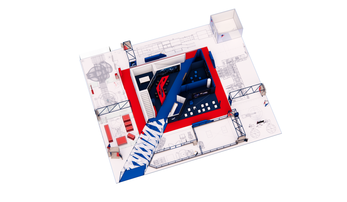 The stand unfolds across three distinct environments, each designed to engage visitors at a progressively deeper level.